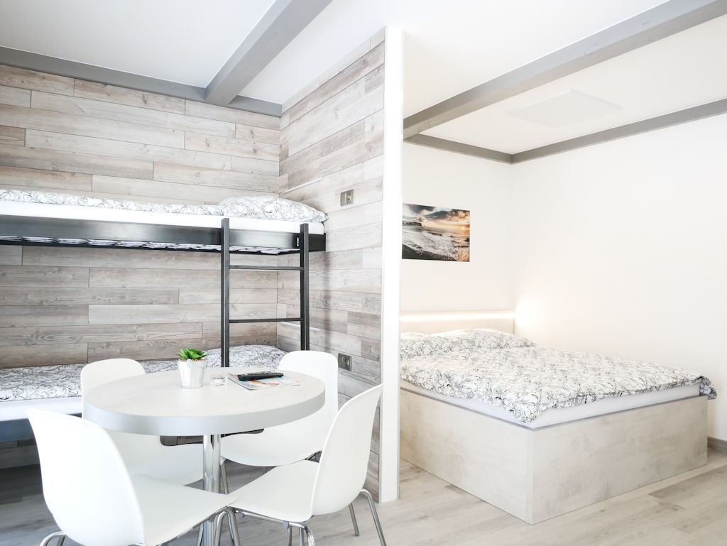 Apartmány POOL se nachází v bezprostřední blízkosti bazénu. Jedná se o čtyřlůžkové apartmány s jednou manželskou postelí a jednou patrovou postelí. Apartmán je vybaven kuchyňským koutem, sociálním zařízením (sprchový kout, toaleta, umývadlo). K apartmánu POOL náleží také terasa s posezením.